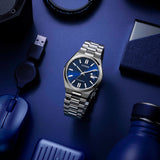 Constructed with a durable stainless-steel case and bracelet, this watch is designed to withstand the rigors of daily wear while exuding timeless style. The inclusion of a date function adds practicality to its design, ensuring it remains functional in various settings. Featuring a convenient push-button buckle, the bracelet offers a secure and comfortable fit on the wrist, ideal for all-day wear. The sapphire crystal protects the dial from scratches, preserving its clarity and beauty for years to come.