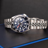 - Dual Time: Three Time zones. Main Hands, G.M.T Hand, Bezel can be set on different times.