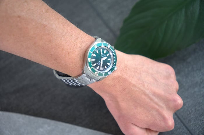 That green dial is the hook. It has depth without feeling loud, and with the lume it still reads like a proper diver. I’d wear it on the bracelet through the week, then swap to a strap on weekends for a more laid-back feel.