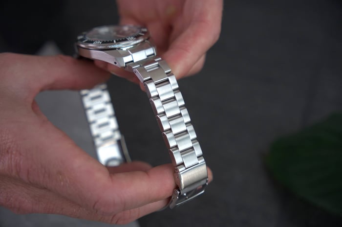 The case is stainless steel, with a size that makes more sense for everyday wear than older, chunkier divers. Official dimensions are 41.7mm across, 12.3mm thick, and 49.5mm lug to lug.
