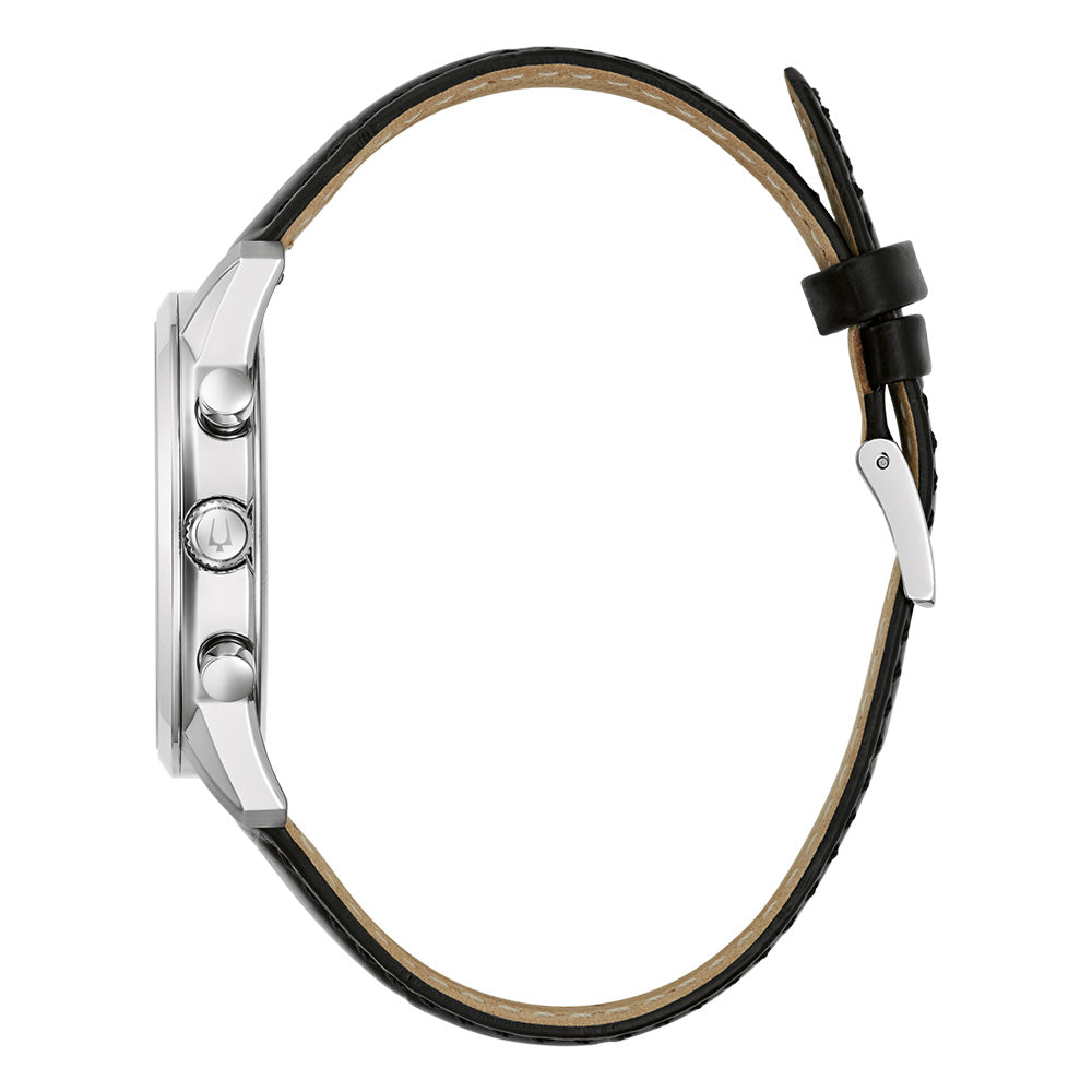 Powered by the Bulova 0S10 Quartz movement, which operates on a reliable battery, the chronograph can accurately time events up to 12 hours to the nearest second. The watch boasts a comfortable 41mm case size with a slim 9.7mm thickness and a lug width of 20mm. Protected by a domed mineral crystal, the dial maintains clarity and resists scratches.
