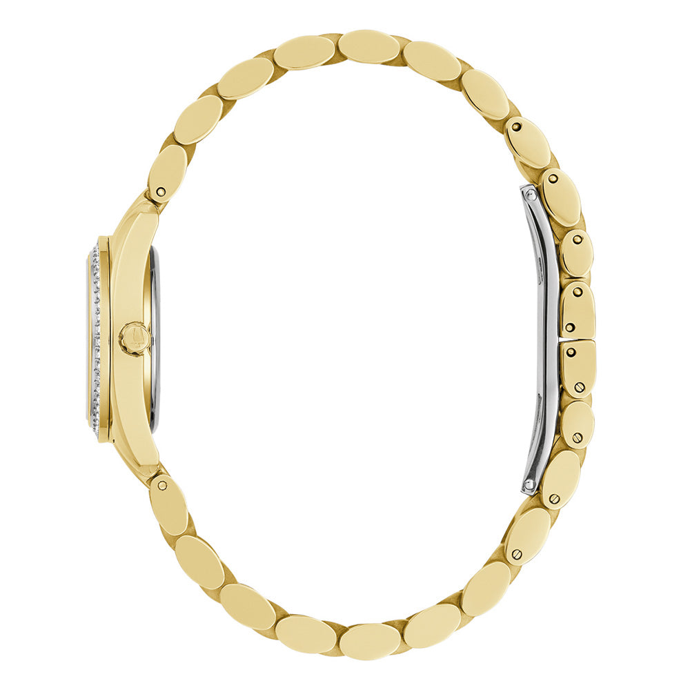 The mother-of-pearl dial exudes luxury, showcasing gold-tone details, 8 crystal hour markers, and a pavé-style center adorned with 102 meticulously set crystals. It’s paired with a matching gold-tone stainless steel bracelet and a deployant clasp for a seamless finish.