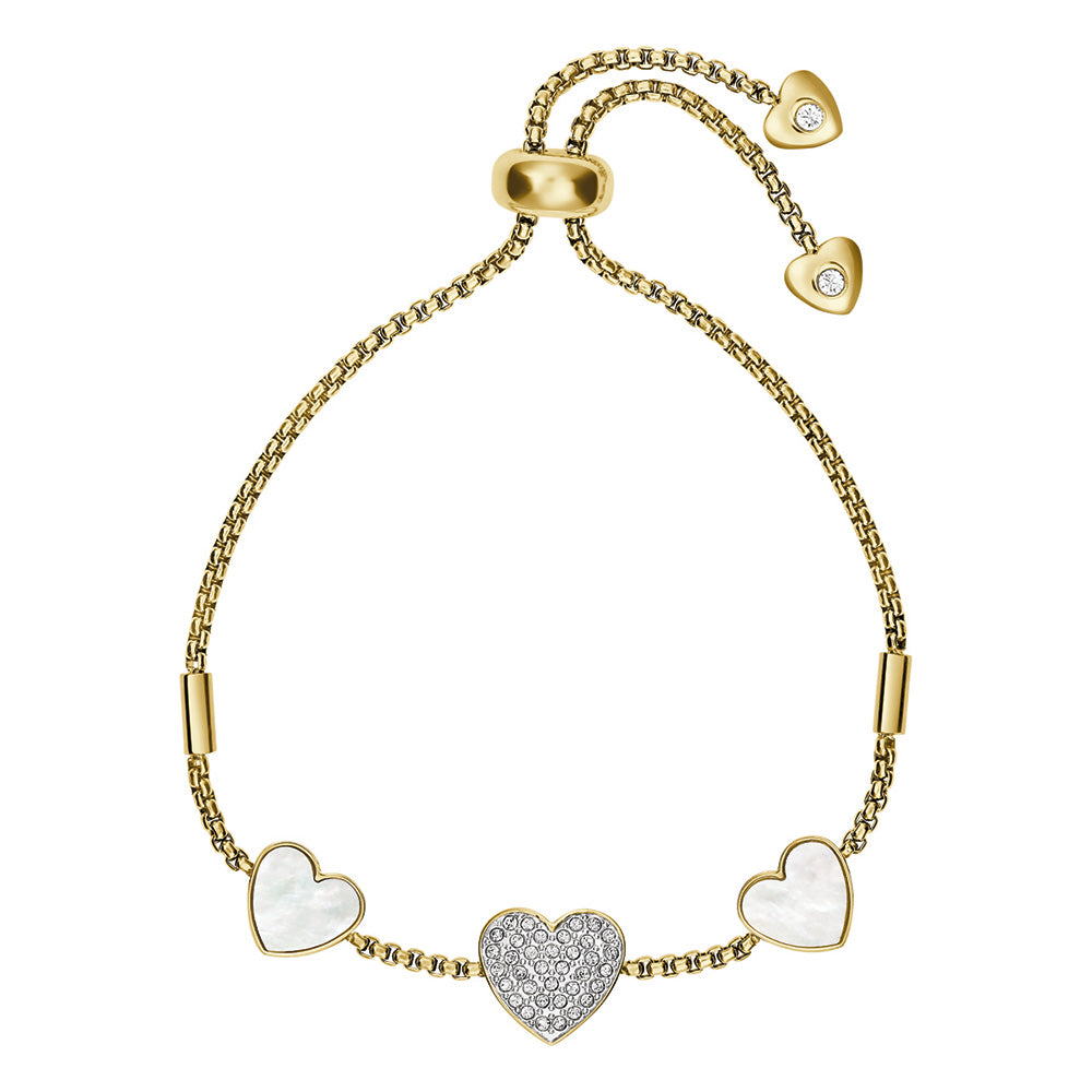 Completing the set are two stylish bracelets: a gold-tone memory bangle featuring mother-of-pearl hearts framed by 36 crystals, and a modern bolo chain bracelet with alternating mother-of-pearl and pavé crystal hearts, set with a total of 38 crystals.