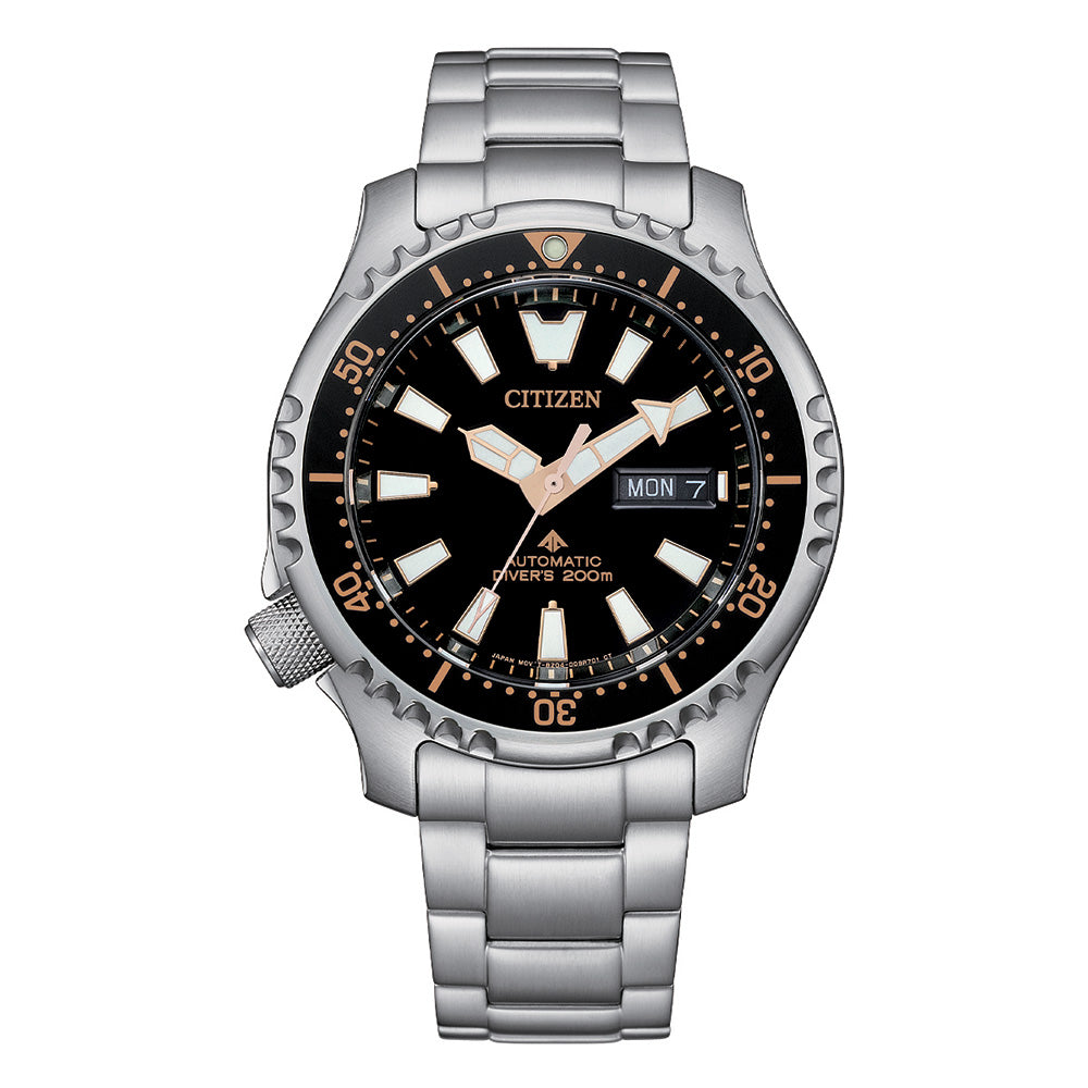 The design includes a 42mm three-piece case, anti-reflective sapphire crystal, and a stainless-steel bracelet. A black rotating bezel with an easy-grip aluminium ring surrounds the black dial, accented with luminous hands and markers for excellent visibility. The case back is engraved with a fugu motif, adding a distinctive touch.
