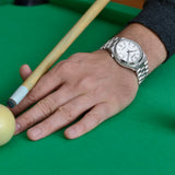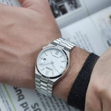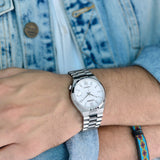 Crafted from durable stainless steel, both the case and bracelet exude durability and refinement, making this timepiece suitable for any occasion. The inclusion of a date function adds practicality to its design, enhancing its overall functionality.