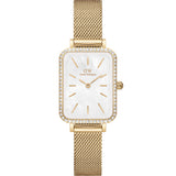 The Daniel Wellington DW00100668 Quadro exudes refined elegance with its distinctive design. Featuring a luxurious gold rectangular case that frames a lustrous Mother of Pearl dial, this watch stands out with its sophisticated style. The 20x26mm double-plated stainless-steel case pairs seamlessly with a gold stainless steel mesh strap, ensuring a comfortable and stylish fit. Powered by precise Japanese quartz movement and with 30 meters of water resistance, the Quadro combines timeless beauty with practical durability.