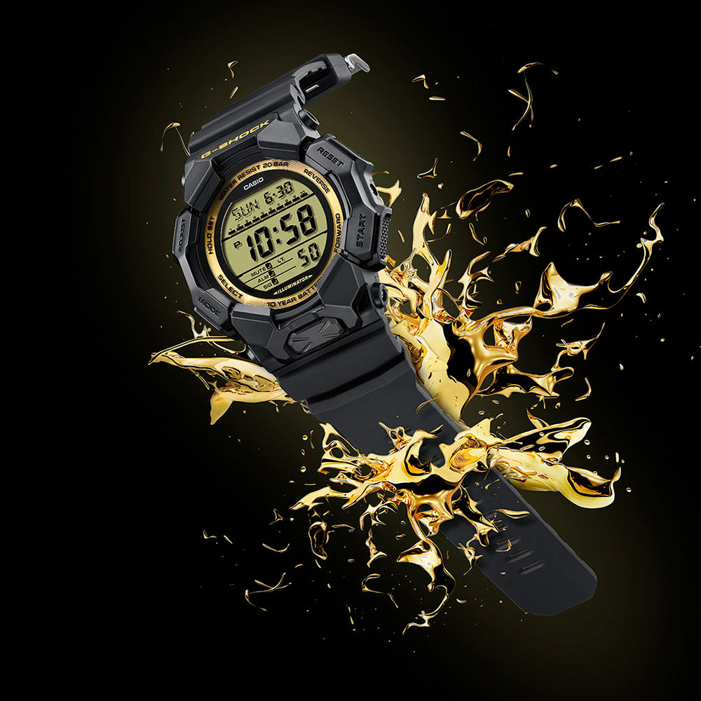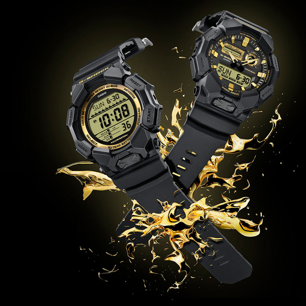 This lineup showcases the iconic G-SHOCK silhouette in deep black, energized with striking gold accents for a look that’s both powerful and stylish. The GD-010GB-1A9 stands out with a gold-highlighted LCD ring, amplifying the impact of its large-face design. Mirror finishing across key surfaces adds depth and dimension, while the blacked-out case and band provide the perfect backdrop to make the gold details shine even brighter.