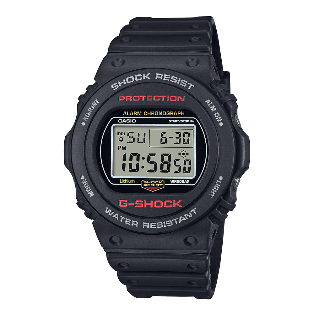 The design stays true to G-SHOCK’s signature monotone black aesthetic, highlighting the rugged resin texture. Its bold, inverted LCD adds striking contrast to the tough, minimalist face. Alongside its timeless look, it offers essential features such as a stopwatch, timer, and LED backlight for everyday practicality.