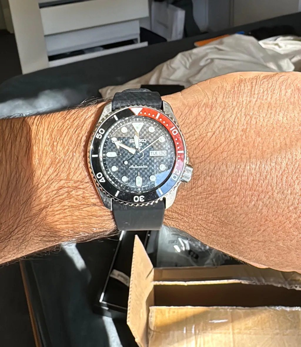 With a case size of 42.5mm and a thickness of 13.8mm, the SRPJ97K offers a lug width of 22mm and weighs approximately 100gm. Like all Seiko 5 models, it carries a WR rating of 100m and includes a pull-out crown.