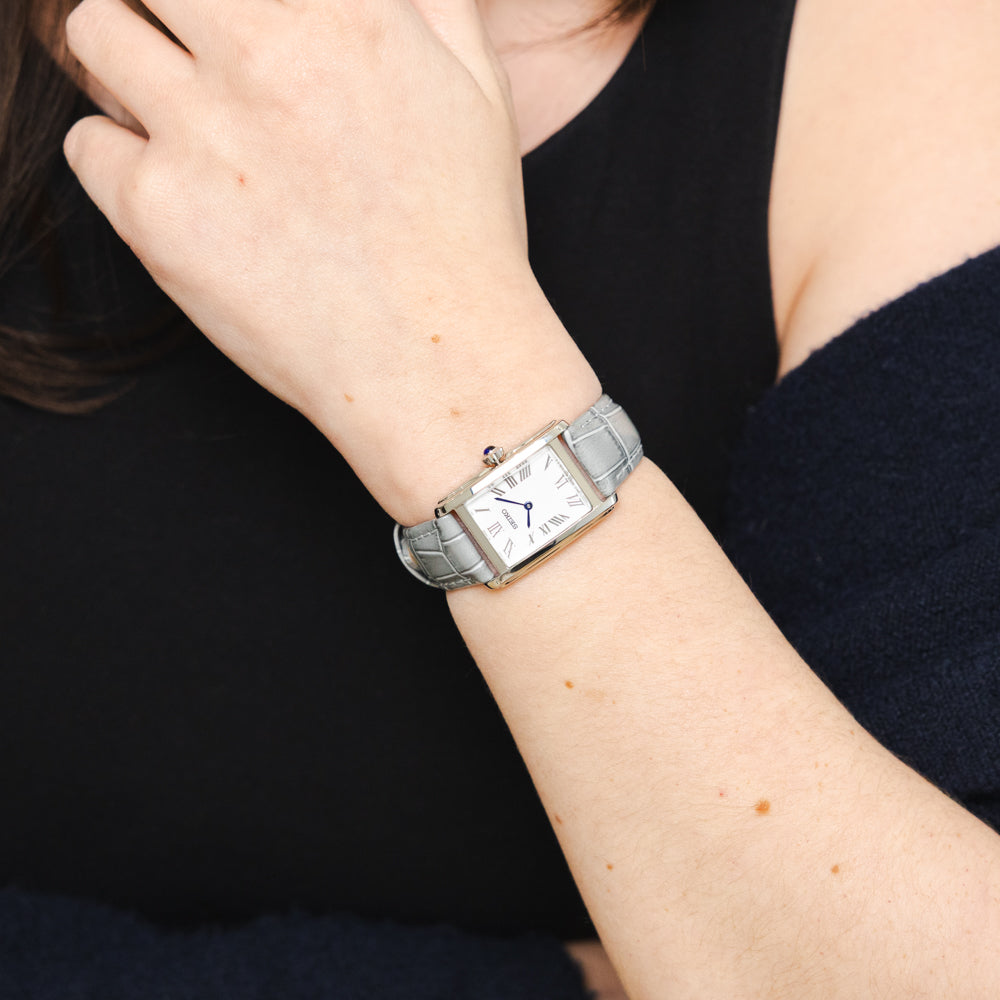 The watch is housed in a 22.2mm rectangular stainless-steel case and paired with a sleek grey leather strap for a sophisticated finish. Powered by the Calibre 4N30 quartz movement and offering 50 metres of water resistance, it’s a graceful everyday piece with a subtle touch of luxury.