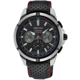 Crafted from stainless steel, the SSB437P-9 boasts a case diameter of 42mm and a slim profile measuring 11.8mm in thickness. It features a lug-to-lug distance of 50.2mm and a lug width of 20mm. Complementing its robust build is a black racing leather strap secured by a three-fold safety clasp with a push button release. Designed for versatility, this watch is water-resistant up to 100 meters and incorporates scratch-resistant Sapphire Crystal glass. Powered by the Seiko Quartz Caliber 8T63, it maintains an approximate accuracy of +/- 15 seconds per month within a normal temperature range of 5 to 60 degrees Celsius. The crown operates via a pull-out mechanism.