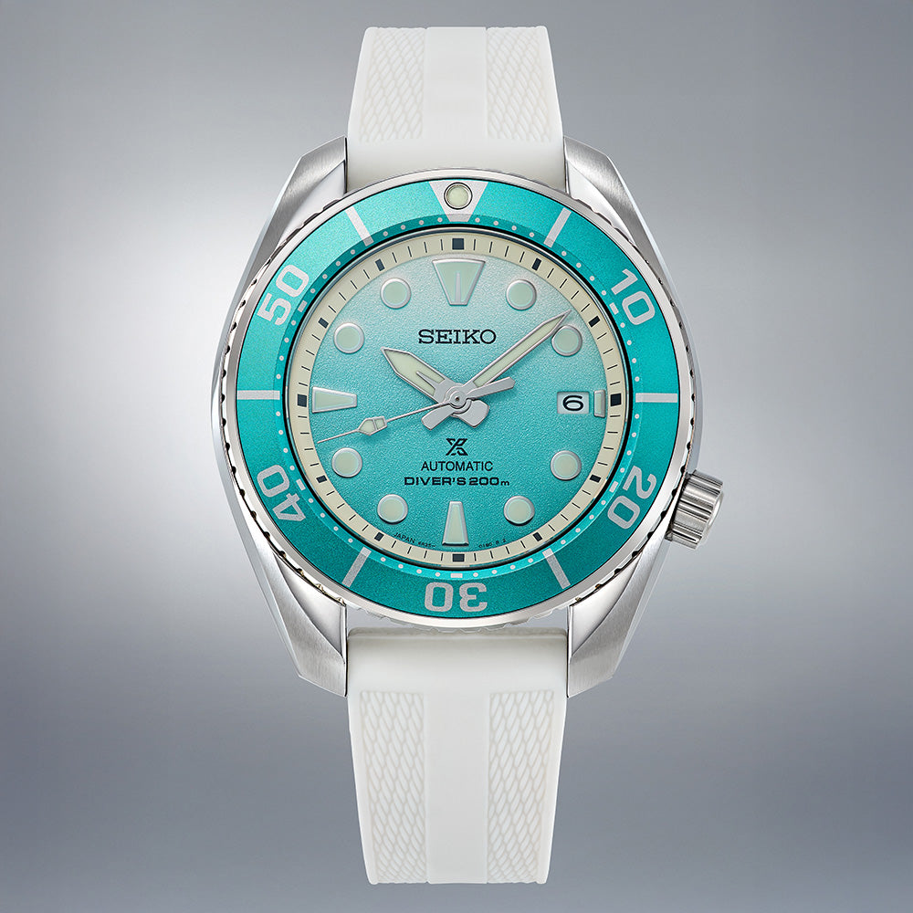Inspired by the serene beauty of the shifting sandbanks of the Maldives, the Seiko Prospex SPB539J captures the tranquil hues of the sea and the soft transitions of sand and sunlight through its stunning aqua gradient dial. Encased in stainless steel with a sleek silver finish, the watch features an aqua bezel and a comfortable white silicone strap for a fresh, coastal aesthetic.
