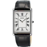 The black leather strap enhances its timeless design, offering both comfort and sophistication. Powered by the reliable Calibre 4N30 quartz movement and water resistant to 50 metres, this watch is a stylish and practical choice for everyday wear.