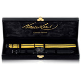 The black leather strap with silver stitching evokes the type of clothing worn in kung fu. Its inside features the same dragon design as shown on the dial. The watch also comes with an additional nylon strap in the design of the iconic yellow tracksuit Lee wore.